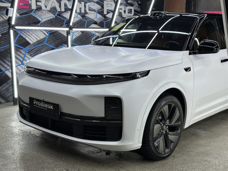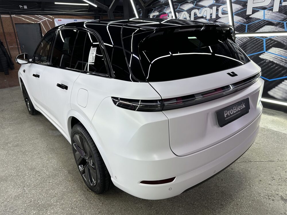 Комплексная оклейка белого Lixiang L7 с акцентом на контраст, защиту и визуальный стиль. Комбинация матовой антигравийной плёнки и чёрных акцентов позволила создать премиальный, минималистичный образ с максимальной защитой кузова и деталей.