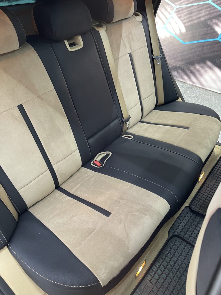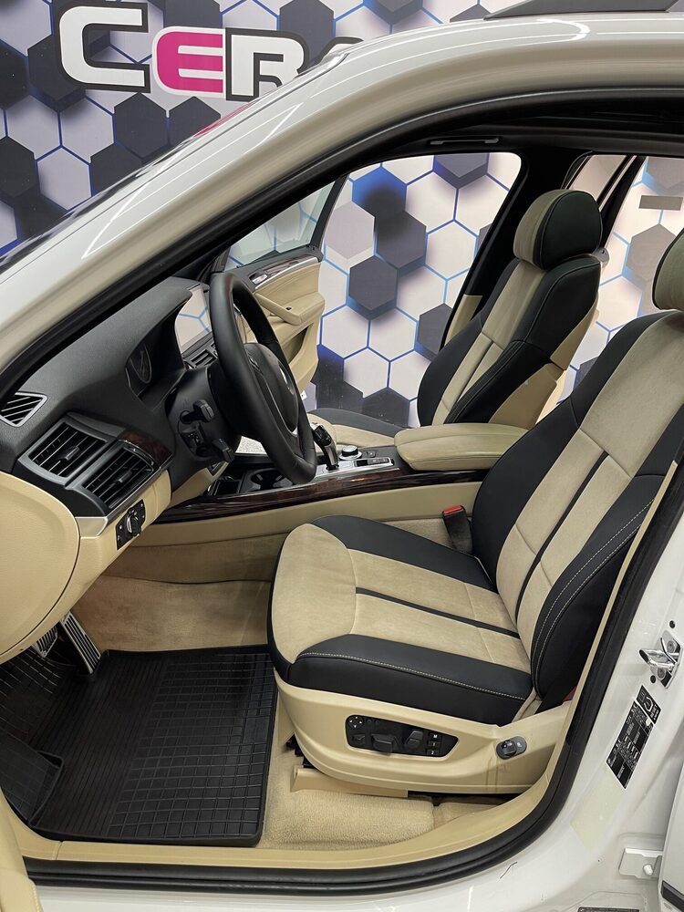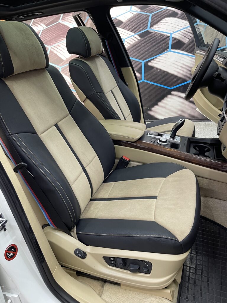 Мы выполнили индивидуальный пошив модельных чехлов для BMW X5, используя сочетание черной экокожи и бежевого материала Teddy с белой и черной ниткой. Чехлы идеально сидят на сиденьях, подчеркивая стиль и комфорт автомобиля, а также защищают салон от износа. Наша перетяжка салона автомобиля в Алматы – это качество, стиль и долговечность!