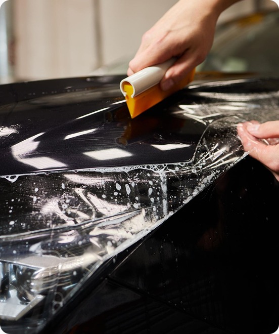 Мастер аккуратно наклеивает полиуретан, используя специальный раствор. Мы следим, чтобы под пленкой не осталось пузырьков воздуха или пыли.